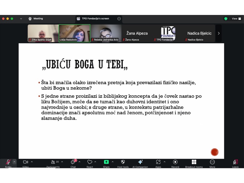 U prvom predavanju, prof.dr. radulović uvodi učesnice i učesnike u ovu kompleksnu temu, nudeći analitički i angažiran pristup koji povezuje teoriju i društvenu stvarnost. Pitanje “ubiti Boga u nekome” ne odnosi se na religiju u doslovnom smislu, već na gubitak dostojanstva, samopouzdanja i unutarnje vrijednosti osobe. U kontekstu rodno zasnovanog nasilja, ono simbolizira proces kroz koji nasilje – bilo fizičko, psihološko ili strukturalno – razara osjećaj vlastite vrijednosti, sigurnosti i duhovnog integriteta žene.